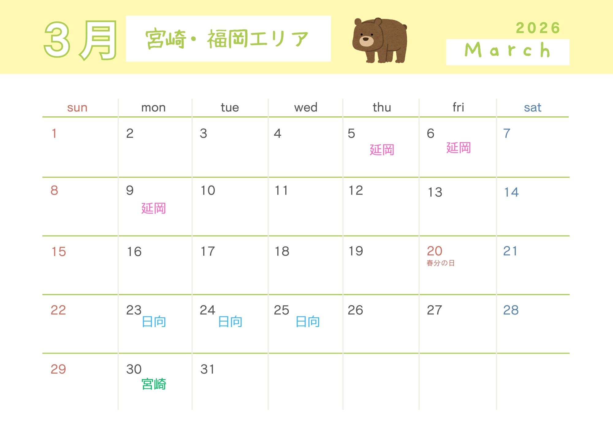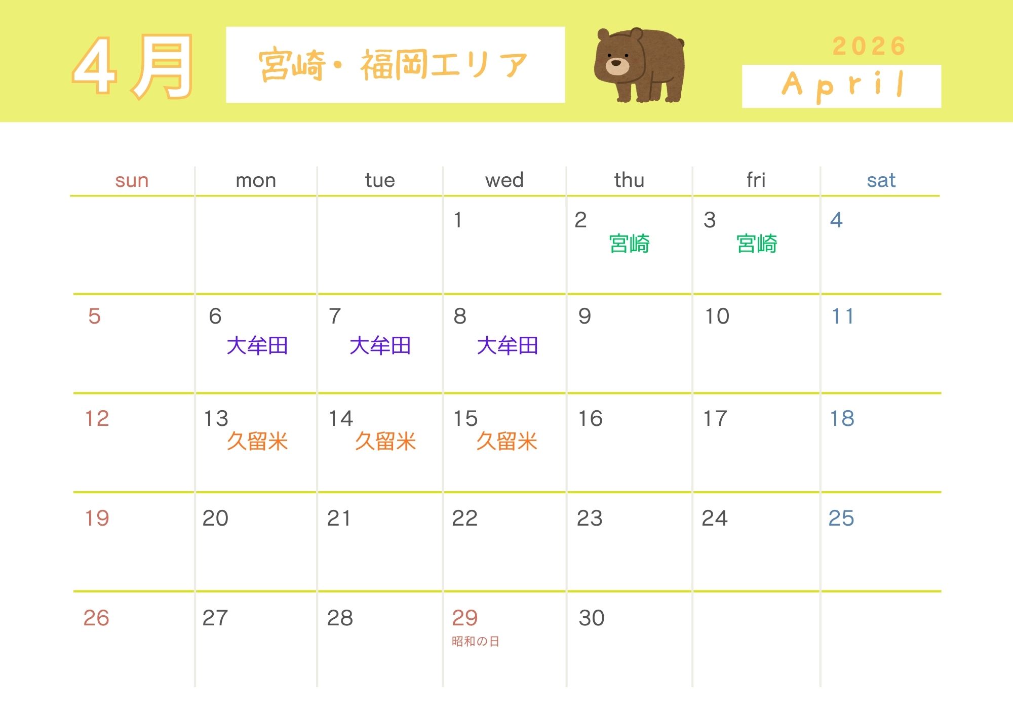 🐻福岡県(ゆめタウン大牟田店)、宮崎県(イオン日向店・延岡店・宮崎店)の開催日スケジュールはこちら↓↓↓